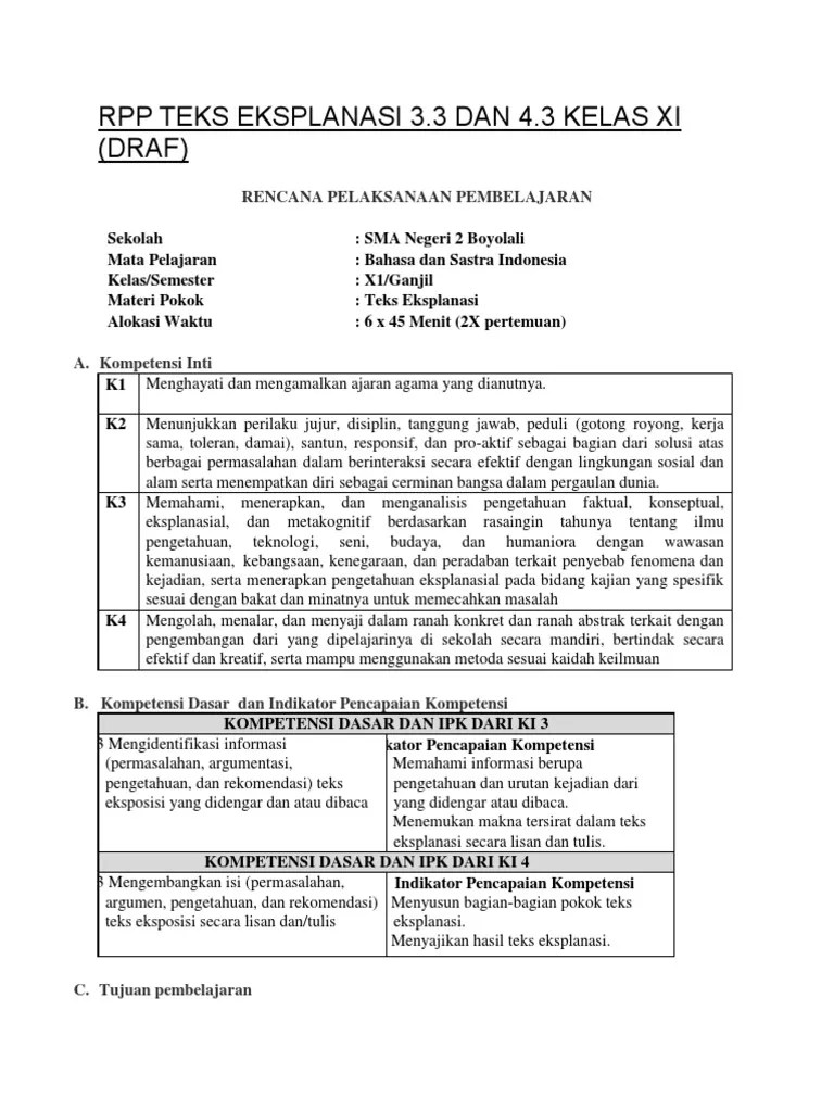 Dan bagaimana suatu fenomena atau kejadian itu bisa terjadi disebut teks eksplanasi. Menghayati dan mengamalkan materi teks eksplanasi sebagai bentuk penghayatan dan. Rpp bahasa indonesia kelas vii kurikulum 2013 contoh rpp bahasa indonesia kelas . Menganalisis struktur dan kebahasaan teks eksplanasi. Menguasai materi teks eksplanasi dengan menunjukkan perilaku jujur, disiplin,.